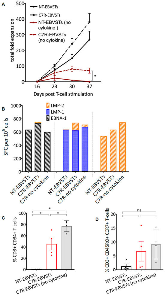 Long-term culture of C7R-EBVSTs in the absence of exogenous cytokines administration. From day 16, C7R- and NT-EBVSTs were restimulated weekly with the irradiated antigen-presenting cells complex used for S2 with or without IL-7 and IL-15 that were replenished every 2 to 3 days. (A) Total fold expansion of EBVSTs from day 16 to 37. Day 16 was considered the starting time point for this analysis (n = 3) Statistical comparisons were determined using paired two-tailed Student’s t-test on day 16, fold expansion p < 0.05, (0.12 (ns: non-significant), 0.033 (*). The data shown are plotted as mean ± SEM. (B) Antigen-specificity on day 30 as measured by ELIspot assay. Y-axis shows the number of cells per 105 EBVSTs that produced IFNγ in response to stimulation with EBV antigens (n = 3). (C,D) Flow cytometric analysis was conducted on day 30 to evaluate the % frequency of (C) CD3+ CD34+ T-cells to determine the frequency of C7R expressing EBVSTs and (D) CD3+ CD45RO+ CCR7+ T-cells to evaluate their surface CCR7 expression.