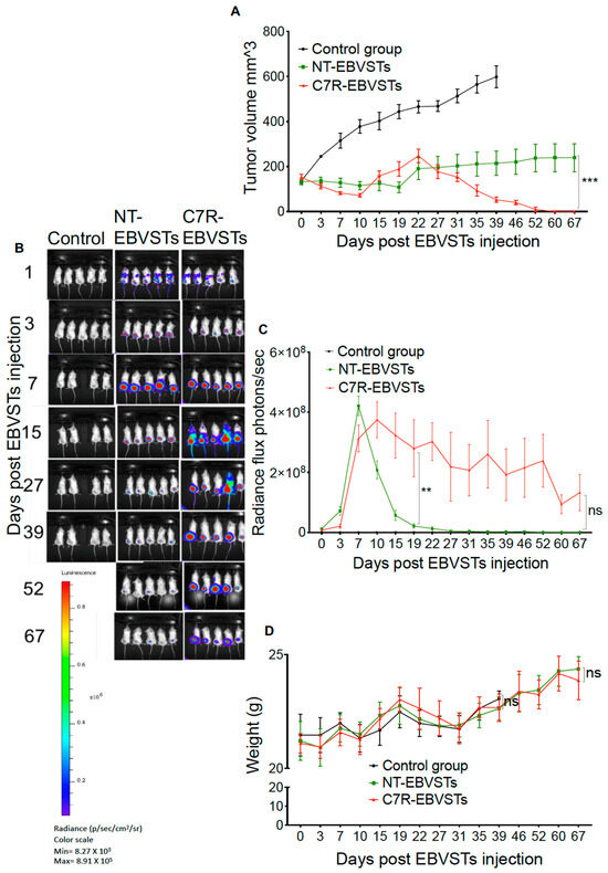 To evaluate the persistence and anti-tumor effects of C7R-modified EBVSTs in vivo, we implanted EBV-transformed B lymphoblastoid cell lines (LCLs) subcutaneously in NSG mice. Ten days after implantation, when tumors were palpable, we adoptively transferred 2.5 × 106 autologous GFP-Firefly-luciferase (GFP-ff-luc) expressing NT- or C7R-EBVSTs, and measured tumor volume and T-cell bioluminescence to evaluate anti-tumor efficacy and T-cells’ persistence over time. Tumor clearance, as determined by a lack of palpable tumor, was observed on day 67 after C7R-EBVST infusion. At this time, tumors measured 239.49 mm3 ± 61.96 mm3 in mice receiving NT-EBVSTs (Figure 4A). The superior anti-tumor efficacy of C7R-EBVSTs correlated with enhanced T-cell persistence after day 7 as indicated by bioluminescence imaging (Figure 4B,C). The increased radiance flux of C7R-EBSVTs on day 22 post EBVSTs infusion compared to that of NT-EBVSTs (p = 0.004) (Figure 4C) corresponds to a time-point after which tumor volume began to decrease. C7R-EBVST radiance eventually declined to insignificance by day 67 (Figure 4B,C) indicating a lack of in-vivo autonomous growth. Weight loss or other signs of toxicity were not observed in any treatment group (Figure 4D).