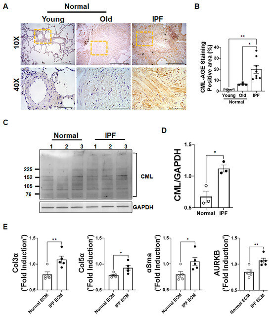 Accumulation of CML-modified extracellular matrix (ECM) proteins in fibrotic lesions of IPF lungs and its effect on expression of fibrosis-related genes. (A) Representative immunostained images of normal young, normal old, and IPF lungs against carboxymethyllysine (CML) were captured at 10× (scale bar, 500 µm) and 40× (scale bar, 100 µm) magnification. (B) Quantification of CML immunostaining in young, old, and IPF lung sections using the BZ-X analyzer. One-way ANOVA was used (* p < 0.05, ** p < 0.01; n = 4–8/group). (C) Immunoblotting of lung lysates from normal and IPF patients with anti-CML and anti-GAPDH antibodies. (D) Normalized CML-adduct levels relative to GAPDH. Student’s two-tailed t-test was used (* p < 0.5; n = 3/group). (E) Quantification of gene transcripts (Col3α, Col5α, αSma, and Aurora kinase B) in healthy lung resident fibroblasts treated with a decellularized ECM from the lungs of healthy individuals and IPF patients. Treatment involved an ECM (1 µg/mL) in DMEM media with 1% FCS for 16 h. Student’s two-tailed t-test was used (* p < 0.05, ** p < 0.01; n = 5/group).