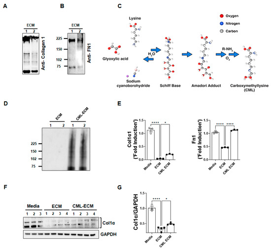 To assess the effects of the ECM, we prepared a soluble ECM extract from the decellularized lungs of mice and confirmed the presence of collagen 1 and FN1 in ECM proteins by immunoblotting (Figure 2A,B). To generate a CML-modified ECM via non-enzymatic glycation, a soluble ECM extract was incubated with glyoxylic acid and sodium cyanoborohydride (Figure 2C). The formation of the CML-modified ECM was confirmed by immunoblotting with antibodies against CML adducts (Figure 2D). To determine the effects of the ECM and CML-modified ECM, fibroblasts isolated from mouse lung cultures were treated with media, the ECM, and the CML-ECM. We observed a significant decrease in the expression of collagen 1 and FN1 gene transcripts by the ECM compared to the media control. However, CML modification of the ECM attenuated the inhibitory effects of the ECM on collagen 1 and FN1 gene expression (Figure 2E). Furthermore, we validated the effects of CML modification on ECM-dependent collagen protein production by fibroblasts using immunoblot analysis and observed a significant loss in the ECM-induced inhibition of collagen 1 production by fibroblasts with CML modification (Figure 2F,G).