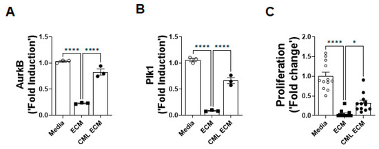 To determine the effects of CML modification on ECM-induced fibroproliferation, lung resident fibroblasts isolated from mouse lung cultures were treated with media, the ECM, and the CML-ECM. We assessed quantitative changes in mitotic gene expression and observed a significant decrease in the expression of fibroproliferative genes, Aurora kinase B (AurkB) and Polo like kinase 1 (Plk1), in fibroblasts treated with the ECM compared to those treated with media. This decrease in the expression of AurkB and Plk1 by the ECM was significantly attenuated with CML modification (Figure 3A,B). To validate these transcriptional changes in relation to fibroproliferation, we performed BrdU incorporation-based proliferation assays and observed that CML modification attenuated the anti-proliferative effects of the ECM on fibroblasts (Figure 3C).