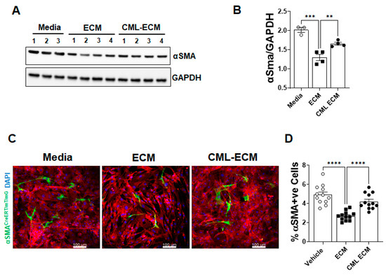 To test effect of the ECM and CML-ECM on myofibroblast transformation, we quantified the levels of αSma protein in lung resident fibroblasts treated with media, the ECM, or the CML-ECM. We observed a significant reduction in αSma in fibroblasts treated with the ECM compared to media, and this decrease was significantly attenuated with CML modification of the ECM (Figure 4A,B). To determine the effects of the ECM and CML-ECM on FMT, we used a cell fate-mapping strategy based on the lineage-specific expression of αSMA in lung-resident fibroblasts isolated from αSMA reporter mice [31]. In this model, the activation of Cre recombinase under the control of the αSMA promoter removes the STOP cassette between the 2 loxP sites, which irreversibly changes the expression of membrane tomato (mT) to membrane GFP (mG) in αSMA-expressing lung-resident fibroblasts. Lung-resident fibroblasts isolated from αSMA reporter mice were treated with media, the ECM, or the CML-ECM in the presence of 4-hydroxy-tamoxifen for 72 h. We observed a significant decrease in the number of myofibroblasts (green cells) in reporter fibroblasts treated with the ECM compared to media. This decrease in FMT was attenuated with the CML modification of the ECM, which supports increases in the percent of myofibroblasts by the CML-ECM compared to the ECM (Figure 4C,D).