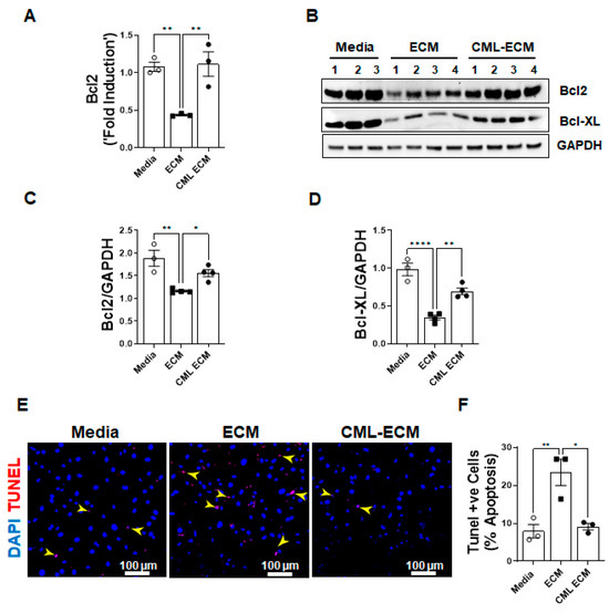 To assess the effects of the ECM and CML-ECM in the survival of fibroblasts, we quantified the expression of anti-apoptotic BCL2 gene transcripts in fibroblasts treated with media, the ECM, and the CML-ECM. We observed a significant inhibition in the expression pro-survival Bcl2 gene transcripts by the ECM compared to media, and this decrease was attenuated with CML modification of the ECM (Figure 5A). We quantified changes in the protein levels of Bcl2 and Bcl-XL in lung resident fibroblasts treated with media, the ECM, and the CML-ECM for 72 h. Consistent with transcriptional changes, there was a significant decrease in Bcl2 and Bcl-XL protein levels in fibroblasts by the ECM compared to media, and this decrease was attenuated with CML modification of the ECM (Figure 5B–D). To determine the effects of the ECM and CML-ECM on the apoptotic clearance of fibroblasts, we treated lung resident fibroblast with media, the ECM, and the CML-ECM for 72 h and quantified TUNEL-positive fibroblasts. Consistent with changes in survival gene expression, we found a significant increase in the number of apoptotic cells treated with the ECM compared to media, and this increase was attenuated with CML modification of the ECM (Figure 5E,F).