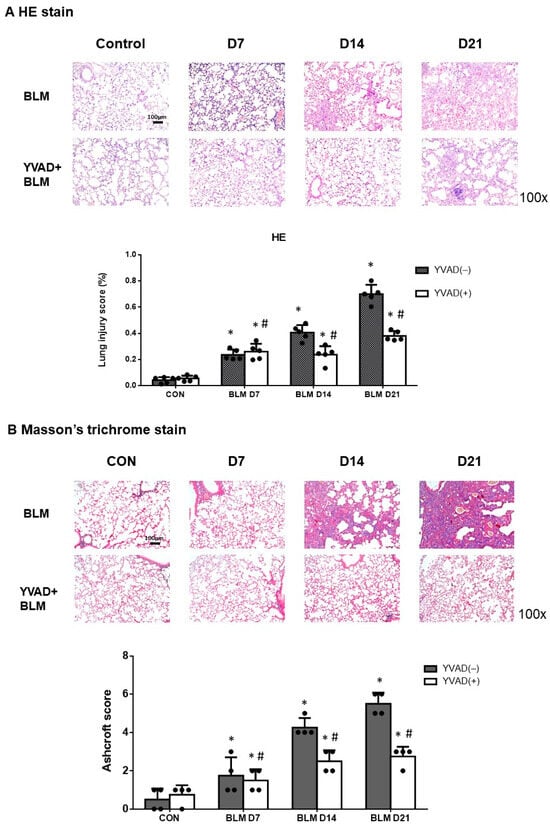 The intratracheal administration of bleomycin-induced lung injury is evidenced histopathologically by the presence of alveolar infiltrates of neutrophils (Supplementary Figure S1), thickening of the alveolar walls and interstitium, and extensive fibrosis (Figure 1A). To investigate the role of NLRP3 inflammasomes in bleomycin-induced pulmonary fibrosis, we compared the lung sections from pulmonary fibrosis mice that underwent preventive treatment with Ac-YVAD-cmk (YVAD), a caspase-1 inhibitor to inhibit the NLRP3 inflammasome signaling pathway via intraperitoneal injection. Histological evaluation of the lungs seven days after bleomycin-induced pulmonary fibrosis showed that lung inflammation and fibrosis were significantly reduced by YVAD preventive treatment. Mice treated with YVAD had significantly decreased lung injury scores (Figure 1A). Masson’s trichrome staining of lung tissue and the Ashcroft score showed progressive pulmonary fibrosis seven days after bleomycin injection (Figure 1B). In contrast, preventive treatment with YVAD significantly reduced bleomycin-induced pulmonary fibrosis, both according to Masson’s trichrome staining and the Ashcroft score (Figure 1B).