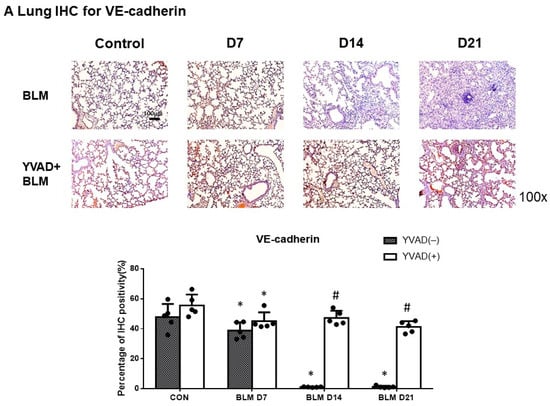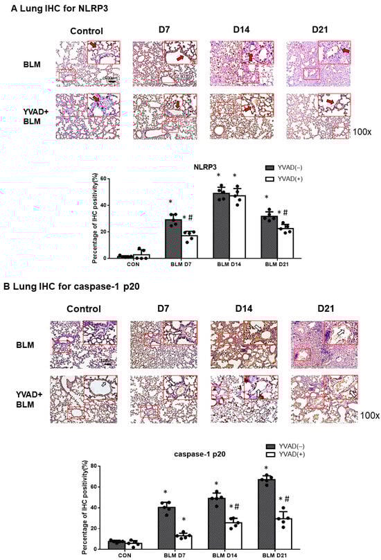 Lung tissues were fixed in 4% paraformaldehyde for 10 min, embedded in paraffin, and cut into 4 µm thick sections. Staining for NLRP3 (1:100, ab214185, Abcam, Cambridge, UK), anti-caspase 1 (p20) (1:1000, AG-20B-0042-C100, AdipoGen AG, Liestal, Switzerland), vascular endothelial cadherin (VE-cadherin) (1:100, ab33168, Abcam, Cambridge, UK), and alpha-smooth muscle actin (α-SMA) (1:100, 14395-1-AP, Proteintech, Rosemont, IL, USA) was performed using the Envision ® + Dual Link System-HRP (DAB+) kits (K4065, DAKO, Carpinteria, CA, USA). Briefly, the sections were deparaffinized with xylene, dehydrated with ethanol, and subsequently heated in 0.01 M citrate buffer (pH 6.0). Endogenous peroxidase activity was inhibited in 3% H2O2 for 10 min at room temperature, and the sections were blocked with a blocking buffer (K4065 kit). Secondary anti-rabbit, antibody-coated polymer peroxidase complexes (K4065 kit) were subsequently administered for 30 min at room temperature, followed by substrate/chromogen treatment (K4065 kit), and further incubation for 5–15 s at room temperature. The sections were counterstained with hematoxylin (109249, Merck, Darmstadt, Germany) for 10 s and subsequently washed in running water for 10 min. The sections were observed and pictured using an Olympus AX80 fluorescence microscope (Olympus America, Melville, NY, USA). The percentage of immunohistochemistry (IHC) signal per field was analyzed using an image process software (Image-Pro Plus, Version 5.1.0.20, Media Cybernetics, Inc., Silver Spring, MD, USA).