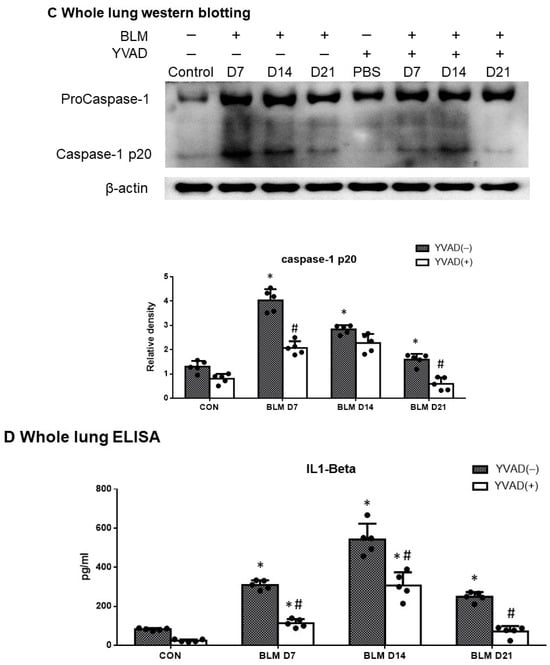 Mice treated with YVAD one hour before bleomycin injection had significantly lower NLRP3 inflammasome and caspase-1 p20 subunit expression seven days after bleomycin injection compared to the bleomycin group; the effect persisted for 21 days (Figure 2A–C). IL-1β levels were also significantly lower seven days after bleomycin injection in the YVAD group compared to the bleomycin group; the effect persisted for 21 days (Figure 2D).