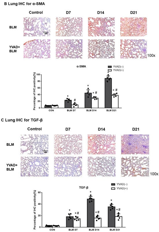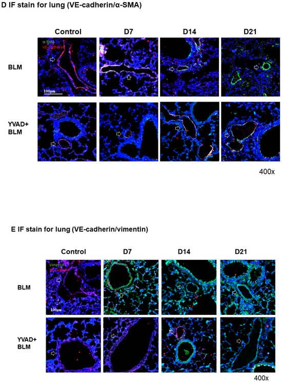 IHC staining of lung tissue and Western blots of the whole lung was performed to detect changes in endothelial and mesenchymal markers in lung tissue following the administration of bleomycin. A decrease in VE-cadherin expression levels was observed seven days after bleomycin use. Increases in TGF-β and α-SMA levels were noted seven days after bleomycin injection. In addition, the inhibition of the NLRP3 inflammasome via YVAD preventive treatment preserved VE-cadherin levels significantly after bleomycin-induced pulmonary fibrosis. The expression of TGF-β and α-SMA was reduced in YVAD-treated mice seven days after bleomycin-induced pulmonary fibrosis (Figure 3A–C and Figure 4). Immunofluorescence double staining was used to detect EndoMT in vessels in lung tissue after bleomycin injection. Decreases in VE-cadherin with concomitant increases of α-SMA expression levels among pulmonary vascular endothelial cells were observed seven days after bleomycin injection (Figure 3D). Similarly, decreases in VE-cadherin with concomitant increases in vimentin expression levels among pulmonary vascular endothelial cells were observed seven days after bleomycin injection (Figure 3E). Decreases in CD31 with concomitant increases of caspase-1 p20 among pulmonary vascular endothelial cells were also observed seven days after bleomycin injection (Figure 3F). Moreover, YVAD treatment significantly preserved VE-cadherin levels with decreased levels of vimentin and α-SMA in vascular endothelial cells after bleomycin-induced pulmonary fibrosis (Figure 3D,E). YVAD also significantly preserved CD31 levels with decreased expression of caspase-1 p20 in vascular endothelial cells after bleomycin use (Figure 3F).