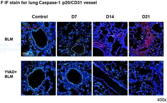 HPMECs were used as an in vitro model of EndoMT. The cells were obtained from ScienCell Company (Carlsbad, CA, USA) and grown in an endothelial cell medium (1001, including 1X Endothelial Cell Growth Supplement, 1X Penicillin/Streptomycin Solution, and 5% FBS). The incubation condition was in room air with 5% CO2 at 37 °C and 95% humidity, and cell cultures were expanded by performing brief trypsinization with 0.25% trypsin in PBS containing 0.025% ethylenediaminetetraacetic acid. The experiments were conducted on passage 2–3 HPMECs. These HPMECs were stimulated with YVAD (50 μM/mL) for 30 min and treated with bleomycin (100 mU/mL) for 90 min. The cell cultures were removed for all liquid and washed 2 times with 1× PBS. Then, cells were fixed with 4% paraformaldehyde. After permeabilized with 0.5% Triton X-100 (in PBS) and blocked with 3% FBS (in PBS) for 60 min at room temperature, NLRP3 (1:100, ab214185, Abcam, Cambridge, UK) and anti-caspase 1 (p20) (1:1000, AG-20B-0042-C100, AdipoGen AG, Liestal, Switzerland) as primary antibodies were used overnight at 4 °C. The second day, goat anti-rabbit IgG H&L (Alexa Fluor® 488) (1:400, ab150077, Abcam, Cambridge, UK) and goat anti-rabbit IgG H&L (Cy5 ®) (1:400, ab6564, Abcam, Cambridge, UK) as secondary antibodies were incubated at 37 °C for 2 h. The culture slides were mounted by mounting medium with DAPI (H-1200, Vector Laboratories, Burlingame, CA, USA) to obtain nuclear staining. Cells images were taken on a confocal microscope (FV10i, Olympus America, Melville, NY, USA).