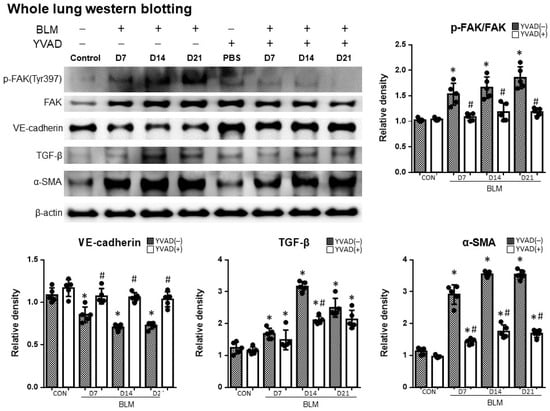 Mouse lung tissues were homogenized in a lysis buffer with protease inhibitors (1862209, Thermo, Waltham, MA, USA). Protein homogenate was resolved equally on 7.5–10% sodium dodecyl sulfate-polyacrylamide electrophoresis gels and transferred onto the polyvinylidene fluoride membranes. Blots were blocked in a tris-buffered saline with Tween (TBST) containing 5% milk and directly detected with the following primary antibodies: anti-caspase 1 (p20) (1:1000, AG-20B-0042-C100, AdipoGen AG, Liestal, Switzerland), FAK (1:1000, #3285, Cell Signaling Technology, Danvers, MA, USA), p-FAK (1:500, #3284, Cell Signaling Technology, Danvers, MA, USA), VE-cadherin (1:1000, ab33168, Abcam, Cambridge, UK), TGF-β (1:500, #3711, Cell Signaling TECHNOLOGY, Danvers, MA, USA), α-SMA (1:1500, 14395-1-AP, Proteintech, Rosemont, IL, USA), and β-actin (1:5000, 20536-1-AP, Proteintech, Rosemont, IL, USA). Blots were subsequently washed in TBST, incubated in horseradish peroxidase secondary antibodies, and probed using an enhanced chemiluminescence substrate (Pierce Biochemicals, ThermoFisher SCIENTIFIC, Waltham, MA, USA). Each blot was exposed to a film, and the relative density of immunoreactive bands was determined using an ImageJ program, Version 1.53q (National Institute of Health, Bethesda, MD, USA).