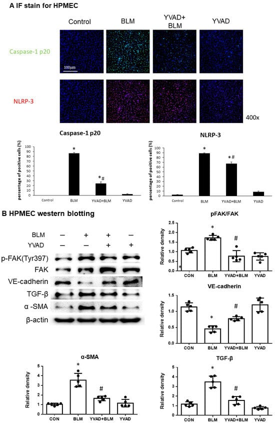 Inhibition of NLRP3 inflammasome reduced BLM-induced EndoMT in vitro. (A) IF stain of HPMEC showed that the expression of caspase-1 p20 and NLRP3 was increased significantly in HPMEC following the administration of bleomycin. However, inhibition of NLRP3 inflammasome by YVAD reduced the increases of caspase-1 p20 and NLRP3 expression after bleomycin use; (B) Western blot assays of the whole cell lysates of HPMEC revealed increased p-FAK-to-FAK ratio, expressive levels of TGF-β and α-SMA after BLM stimulation, and decreased VE-cadherin expression. Administration of YVAD diminished the increased levels of p-FAK-to-FAK ratio, TGF-β, and α-SMA expression after bleomycin injection. Moreover, YVAD significantly recovered the decreased levels of VE-cadherin after bleomycin stimulation; (C) IF double staining of HPMEC demonstrated decreased expression of VE-cadherin with concomitant increased expression of α-SMA after bleomycin stimulation. Similarly, decreases in VE-cadherin with concomitant increases in vimentin expression levels were observed in HPMEC after bleomycin administration. YVAD significantly preserved VE-cadherin levels with decreased expression of α-SMA and vimentin after bleomycin use. * p < 0.05 compared with control, # p < 0.05 compared with BLM group.