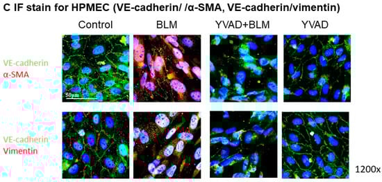 Immunofluorescence double staining of HPMEC was performed to detect EndoMT in HPMEC following the stimulation of bleomycin. Decreases in VE-cadherin with concomitant increases in α-SMA expression levels were observed. Similarly, decreases in VE-cadherin with concomitant increases in vimentin expression levels were also observed. However, the inhibition of the NLRP3 inflammasome by YVAD significantly preserved VE-cadherin expression levels with decreased expression of α-SMA and vimentin after bleomycin stimulation (Figure 5C).