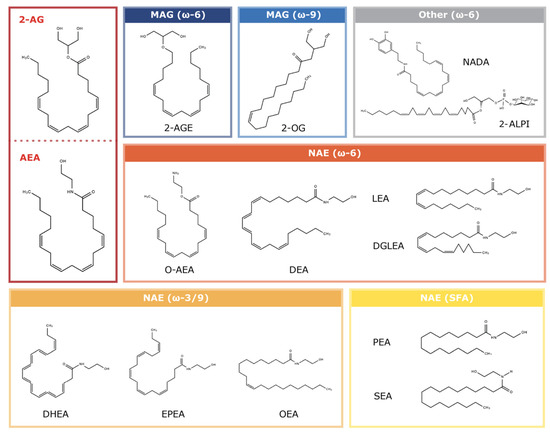 All eCBs are enzymatically synthesized from abundant membrane phospholipids, predominantly conjugated with polyunsaturated fatty acids (PUFAs). Specifically, 2-AG is majorly derived from membrane phosphatidylinositols (PIs), substituted with arachidonic acid, while AEA is synthesized from N-arachidonoyl phosphatidylethanolamine (PE) [3,31]. Between these two major eCBs, 2-AG is much more abundant and has a significantly higher agonist efficacy for both CB1R and CB2R than AEA [13]. Even though 2-AG and AEA are considered as the major eCBs, many of their congeners from the N-acylethanolamine (NAE) and monoacylglycerol (MAG) signalling lipid classes are also thought to interact with the ECS (Table 1; Figure 1) [32]. These molecules include 2-O-arachidonoylethanolamine (virodhamine or O-AEA), N-docosahexaenoylethanolamine (DHEA), N-eicosapentaenoylethanolamine (EPEA), N-palmitoylethanolamine (PEA), N-oleoylethanolamine (OEA), N-stearoylethanolamine (SEA), docosatetraenoylethanolamide (DEA), N-linoleoylethanolamine (LEA), dihomo-γ-linolenoyl-ethanolamide (DGLEA), arachidonyl glycerol ether (noladin ether or 2-AGE), and 2-oleoylglycerol (2-OG). The discovery of two endogenous CB1R agonists, N-arachidonoyldopamine (NADA) and 2-arachidonoyl lysophosphatidylinositol (2-ALPI), that are not NAEs or MAGs implies that many other bioactive lipids with a similar structure may also act as eCBs. These compounds are still poorly studied in comparison to 2-AG and AEA in the context of the ECS and CNS; thus, this review will focus on 2-AG and AEA.