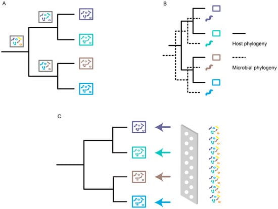 Mechanisms underlying phylosymbiosis. (A) Gain or loss of microbes arises from stochastic processes. (B) Evolutionary processes, such as codiversification, yield congruent phylogenetic trees of hosts and microbes. (C) Ecological filters select suitable environmental microbes to coexist with the hosts.