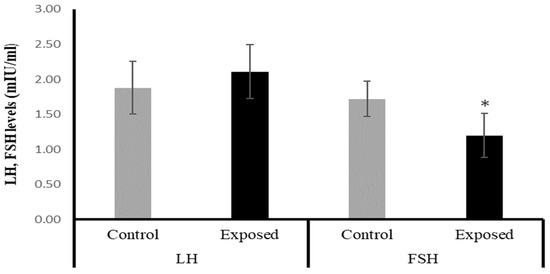 The serum luteinizing hormone (LH) and follicle-stimulating hormone (FSH) levels in control and SOF-exposed female rats. The data were indicated as Mean ± SD. 10 rats in each group. *: Statistically significant difference compared to the control group by Student t-test, p < 0.05.