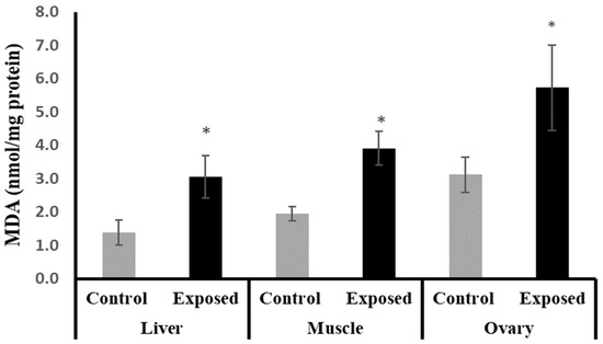 The malondialdehyde (MDA) contents in control and SOF-exposed female rats’ liver, muscle, and ovarian tissues. The data were indicated as Mean ± SD. 10 rats in each group. *: Statistically significant difference compared to the control group by Student t-test, p < 0.05.