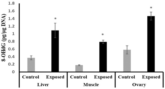 The isolated DNA samples from the liver, muscle, and ovarian tissues were enzymatically digested, as described previously [38,43], and used for the assessment of the 8-OHdG content using an ELISA kit (Chongqing Biospes Co., Ltd. Chongqing, China) following the manufacturer’s recommendation.