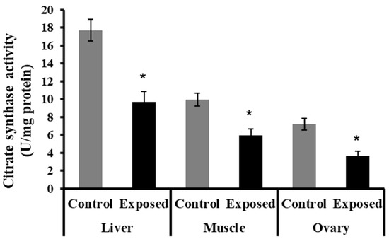 The liver, muscle, and ovarian tissues of SOF-exposed female rats showed significantly lower citrate synthase activity content compared with normal rats (p < 0.001) (Figure 5).