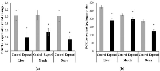 Peroxisome Proliferator-Activated Receptor γ Coactivator-1 α (PGC-1α) expression at mRNA (a) protein (b) levels in control and SOF-exposed female rats’ liver, muscle, and ovarian tissues. The fold change mRNA level vs. control. The data were indicated as Mean ± SD. Ten rats in each group. *: Statistically significant difference compared to the control group by Student t-test, p < 0.05.