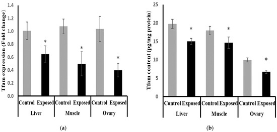 Mitochondrial transcription factor-A (Tfam) expression at mRNA (a) protein (b) levels in control and SOF-exposed female rats’ liver, muscle, and ovarian tissues. The fold change mRNA level vs. control. The data were indicated as Mean ± SD. Ten rats in each group. *: Statistically significant difference compared to the control group by Student t-test, p < 0.05.