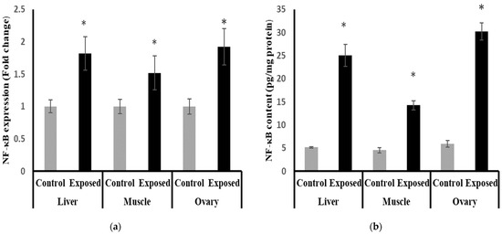 Nuclear Factor Kappa B (NF-κB) expression at mRNA (a) protein (b) levels in control and SOF-exposed female rats’ liver, muscle, and ovarian tissues. The fold change mRNA level vs. control. The data were indicated as Mean ± SD. Ten rats in each group. *: Statistically significant difference compared to the control group by Student t-test, p < 0.05.