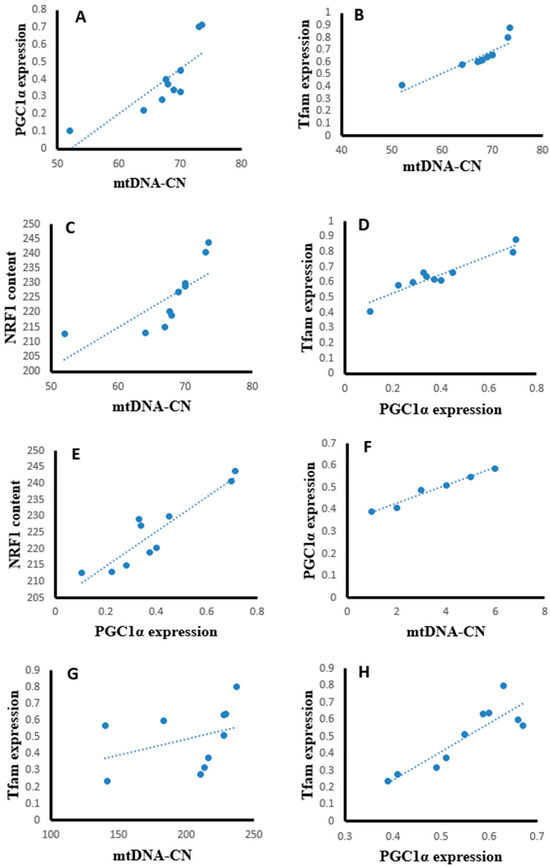 Mitochondria are the powerhouse of the eukaryotic cell and play a central role in regulating cellular metabolism, proliferation, death, and signaling. The mitochondrial cell number is correlated with the mtDNA copy number, and mitochondrial biogenesis is under the control of a complex genetic system [13]. PGC-1α, Tfam, and NRF1 are the key transcription factors regulating a cascade of factors that contribute to the control of mitochondrial metabolism and biogenesis. In brief, PGC-1α binds to both NRF1 and NRF2. In turn, NRF1 interacts with certain promoter regions of the Tfam gene and increases its expression. Tfam plays a major role in mtDNA replication and transcription [14].