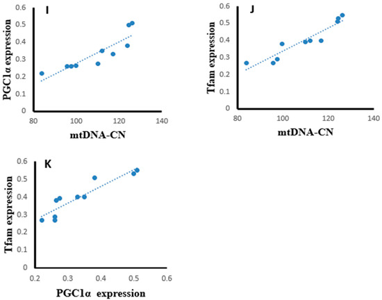 Correlation curves between different parameters in the different tissues of exposed female rats. (A–E) correlation curves in hepatic tissues between mtDNA copy number with (A) PGC-1α expression, (B) Tfam expression, and (C) NRF1 content; PGC-1α expression with (D) Tfam expression and (E) NRF1 content; (F–H) correlation curves in muscle tissues between mtDNA copy number with (F) PGC-1α expression and (G) Tfam expression; (H) PGC-1α expression with Tfam expression, (I–K) correlation curves in ovarian tissues between mtDNA copy number with (I) PGC-1α expression and (J) Tfam expression; and (K) PGC-1α expression with Tfam expression.