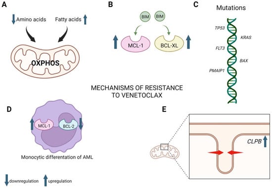 Mechanisms of resistance to venetoclax, including (A) alterations in energy metabolism, shifting from amino acids towards fatty acids; (B) upregulation of MCL-1 and BCL-XL; (C) mutations conferring resistance; (D) monocytic differentiation linked with downregulation of BCL2 and upregulation of MCL-1; (E): narrowing of mitochondrial cristae lumen and overexpression of CLPB. Created with BioRender.com (accessed on 17 August 2023).