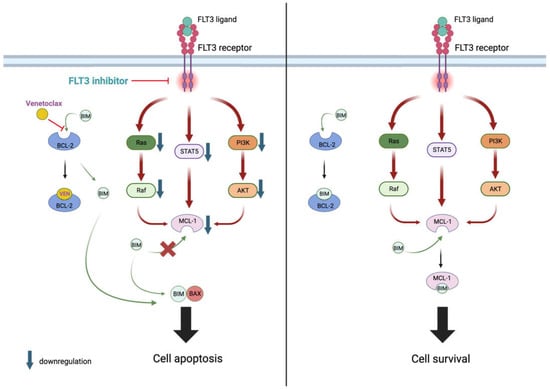 The mechanism of cell apoptosis by the combination of venetoclax and FLT3 inhibitors. The downregulation of MCL-1 prevents the binding of displaced BIM to MCL-1, therefore mediating the apoptosis. Created with BioRender.com (accessed on 17 August 2023).