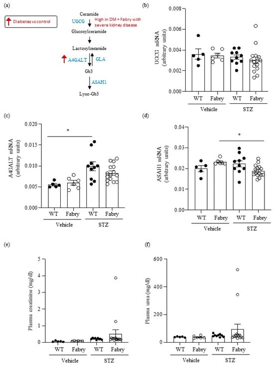 Impact of diabetes on genes encoding enzymes in the Gb3 pathway and on kidney function in wild type and Fabry mice. (a) Scheme of Gb3 synthesis and metabolism: glucosylceramide synthase encoded by Ugcg, Gb3 synthase encoded by A4galt, acid ceramidase encoded by Asah1, and alpha-galactosidase A encoded by Gla. Arrows present a summary of data shown in panels (b–d). (b–d) Kidney mRNA was measured by real time RT-PCR in diabetic wild-type or Fabry mice or vehicle controls. (b) Ugcg, (c) A4galt, (d) Asah1. (e) Plasma creatinine and (f) plasma urea. Data expressed as mean ± SEM of 5–15 animals per group. * p < 0.05 vs. respective vehicle group. Significance (p < 0.05) was assessed by Student’s t-test for two groups of data and ANOVA for three or more groups with Bonferroni post-hoc correction.