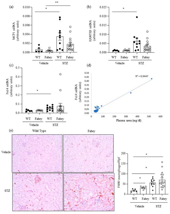 Next, we explored the impact of DM on kidney inflammation and fibrosis in Fabry mice. MCP1 and RANTES are key chemokines upregulated during kidney injury. Kidney Mcp1 and Rantes mRNA were significantly upregulated in diabetic WT mice compared to WT mice (Figure 2a,b), while values in diabetic Fabry mice did not significantly differ from those in diabetic WT mice (Figure 2a,b). The gene expression of the proinflammatory cytokine receptor Fn14 was also significantly increased in diabetic WT mice compared to non-diabetic WT mice (Figure 2c) while diabetic Fabry mice did not differ from either non-diabetic Fabry mice or diabetic WT mice (Figure 2c). Of interest, kidney Fn14 mRNA expression was very high in the two diabetic Fabry mice that developed kidney insufficiency and correlated with kidney function (Figure 2c,d). Kidney inflammation was assessed as infiltration by F4/80+ macrophages (Figure 2e). Both DM and Fabry disease promoted kidney infiltration by macrophages and the combination of DM and Fabry disease resulted in the highest inflammatory infiltrates: over 100 F4/80+ cells per hpf were only observed in mice with both conditions. Both kidney Mcp1 and Rantes gene expression correlated with inflammatory infiltrates and between themselves (Figure S2).