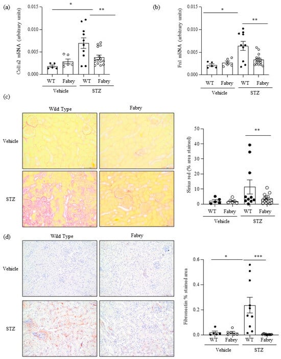 Kidney fibrosis is a characteristic feature of both DKD and Fabry disease [22]. At the mRNA level, there was evidence of activation of fibrosis in diabetic WT mice and this was significantly milder in diabetic Fabry mice, as assessed by the kidney expression of the Col1a2 and Fn1 genes encoding interstitial fibrosis collagen and fibronectin, respectively (Figure 3a,b). Within the time frame studied, kidney fibrosis assessed by Sirius red staining, denoting collagen deposits, and interstitial fibronectin, representing extracellular matrix deposition, was only observed in some diabetic WT mice (Figure 3c,d). Similar to fibrosis gene expression changes, fibrosis was significantly milder in diabetic Fabry mice than in diabetic WT mice (Figure 3c,d). This contrasts with the level/expression of inflammatory markers (Fn14 and F4/80 macrophage infiltration) which were more severe in the diabetic Fabry mice. As was the case for chemokine expression, there was a good correlation between the kidney expression of Col1a2 and Fn1 and between these two genes and Sirius red quantification of fibrosis (Figure S3).
