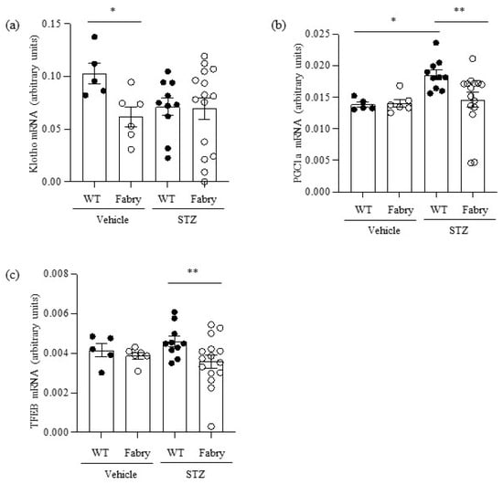 Impact of diabetes on the expression of kidney nephroprotective genes in Fabry mice. (a) Kidney Klotho mRNA, (b) Pgc1α mRNA, (c) Tfeb mRNA. * p < 0.05 vs. WT vehicle, ** p < 0.05 vs. WT diabetic. Data expressed as mean ± SEM of 5–15 animals per group. Significance (p < 0.05) was assessed by Student’s t-test for two groups of data and ANOVA for three or more groups with Bonferroni post-hoc correction.