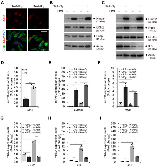 Mild oxidative stress activates the antioxidant response pathway and reduces LCN2 levels in astroglial-enriched cells. (A) immunofluorescence staining to detect intracellular LCN2 and Gfap in astroglial-enriched cells was performed with or without 10 μM NaAsO2 treatment. DNA was visualized with DAPI. (B) immunoblot detection of Hmox1, LCN2, and Gfap was performed using astroglial-enriched cells treated with 10 μM sodium arsenite (NaAsO2) or 100 ng/mL LPS for 1 d. Negative control cells were treated with an equal volume of PBS. (C) astroglial-enriched cells treated with 10 μM NaAsO2 and/or 100 ng/mL LPS for 1 d were subjected to immunoblot detection of Hmox1, Nqo1, NF-κB, and IκB. (D) the expression levels of Lcn2 in astroglial-enriched cells at passage number 1 (P1) and 2 (P2) were determined by qRT-PCR, normalized against Gapdh levels, and expressed as the fold change relative to the control (P1; n = 3). (E–I) astroglial-enriched cells treated as described in (C) were subjected to total RNA isolation and qRT-PCR analysis. The expression levels of Hmox1, Nqo1, Lcn2, Tnf, and Il1a were determined by qRT-PCR, normalized against Gapdh levels, and expressed as the fold change relative to the control (−LPS, −NaAsO2; n = 3). For immunoblot analysis, β-actin was used as a loading control. Representative images of cells or immunoblots are shown (n = 3). qRT-PCR data are expressed as the means ± SEM from the indicated number of samples. Scale bar, 50 μm. * p < 0.05, ** p < 0.01; *** p < 0.001 between two groups as indicated by the horizontal bars.