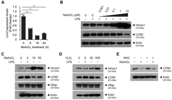 Lcn2 expression levels are reduced by mild oxidative stress in a time-dependent manner. (A) astroglial-enriched cells were treated with 10 μM sodium arsenite (NaAsO2) for 0 to 24 h. Lcn2 expression levels were determined by qRT-PCR, normalized against Gapdh levels, and expressed as the fold change relative to the control (0 h; n = 3). (B) immunoblot detection of Hmox1 and LCN2 was performed using control astroglial-enriched cells (without LPS or NaAsO2 treatment) and cells treated with 100 ng/mL LPS and various concentrations of NaAsO2 up to 10 μM for 1 d. (C) astroglial-enriched cells were treated with 100 ng/mL LPS or with 10 or 50 μM NaAsO2 for 1 d. The cells were then subjected to immunoblot detection of LCN2, Hmox1, and Gfap. (D) immunoblot analysis was performed, as described in (C), using astroglial-enriched cells treated with 100 ng/mL LPS or with 50 or 500 μM hydrogen peroxide (H2O2) for 1 d. (E) immunoblot detection of LCN2 in astroglial-enriched cells treated with 10 mM N-acetyl-L-cysteine (NAC) and/or 10 μM NaAsO2 for 1 d. To investigate the effect of NAC, 10 mM NAC was added 2 h before NaAsO2 treatment. For immunoblot analysis, β-actin was used as a loading control. Representative images of immunoblots are shown (n = 2). qRT-PCR data are expressed as the means ± SEM from the indicated number of samples. ** p < 0.01; *** p < 0.001 between two groups as indicated by the horizontal bars.