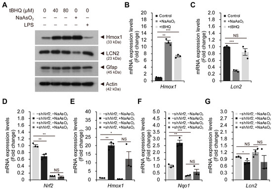 The Nrf2-mediated antioxidant response is not responsible for reduced Lcn2 expression levels. (A) astroglial-enriched cells were treated with 40 or 80 μM tBHQ, 10 μM sodium arsenite (NaAsO2) or 100 ng/mL LPS for 1 d. The cells were then subjected to immunoblot detection of LCN2, Hmox1, and Gfap. (B,C) astroglial-enriched cells were treated with 10 μM NaAsO2 or 40 μM tBHQ for 1 d. The expression levels of Lcn2 and Hmox1 were determined by qRT-PCR, normalized against Gapdh levels, and expressed as the fold change relative to the control (−NaAsO2, −tBHQ; n = 3). (D–G) astroglial-enriched cells were subjected to Nrf2 knockdown (KD) via lentiviral transduction. Negative control cells were transduced with a lentivirus harboring scrambled shRNA sequences. One day after infection, control (−shNrf2) and Nrf2 KD (+shNrf2) cells were treated with 10 μM NaAsO2 or PBS for 1 d. Total RNA was isolated from the cells and subjected to qRT-PCR analysis. The expression levels of Nrf2, Hmox1, Nqo1, and Lcn2 were determined by qRT-PCR, normalized against Gapdh levels, and expressed as the fold change relative to the control (−shNrf2, −NaAsO2; n = 3). For immunoblot analysis, β-actin was used as a loading control. Representative images of immunoblots are shown (n = 2). qRT-PCR data are expressed as the means ± SEM from the indicated number of samples. * p < 0.05, ** p < 0.01; *** p < 0.001 between two groups as indicated by the horizontal bars. NS, not significant.
