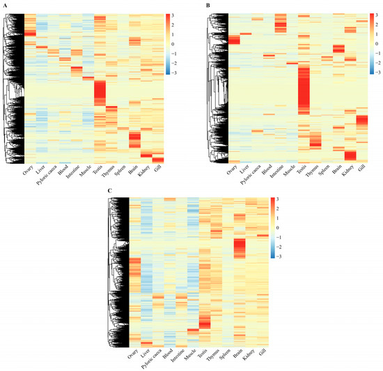 Expression patterns of lncRNAs, lincRNAs and coding genes of turbot in twelve different tissues in S. maximus. Cells with different color in the heat maps correspond to different expression values, which were normalized into log2 (TPM + 1). Normalized expression values were clustered by “complete” method. (A–C) represent the expression patterns of lncRNAs, lincRNAs, and coding genes, respectively.