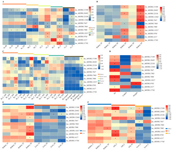 Expression patterns of the 11 comprehensive stress-responsive lncRNA candidates under various abiotic and biotic stresses in S. maximus. (A) Expression patterns under V. anguillarum infection stress. In, Sp, Gi, Ki and Li represented intestine, spleen, gill, kidney and liver, respectively. (B) Expression patterns under Megalocytivirus infection stress. C and V represented the control and Megalocytivirus infection group, respectively. (C) Expression patterns under E. scophthalmi infection stress. Ki, Py, Sp, Th, and Bl represented kidney, pyloric caeca, spleen, thymus, and blood, respectively. (D) Expression patterns under oxygen stress. (E) Expression patterns under heat stress. (F) Expression patterns under salinity stress. * indicated the DE lncRNAs with |log2fold change (FC)| > 1 and false discovery rate (FDR) < 0.05.