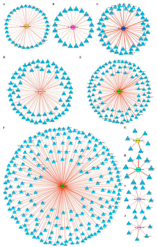 The co-expression network between 10 comprehensive stress-responsive lncRNAs and coding genes in S. maximus. (A–J) represent lnc_MSTRG.17190, lnc_MSTRG.22156, linc_MSTRG.7983, lnc_MSTRG.17785, lnc_MSTRG.4117, lnc_MSTRG.7990, linc_MSTRG.13517, lnc_MSTRG.9703, linc_MSTRG.12463, and lnc_MSTRG.7047, respectively. No coding gene is significantly related to linc_MSTRG.28492. Elliptical and triangular nodes represent lncRNAs and coding genes, respectively. The edges between nodes represent the interaction relationships of lncRNAs and coding genes, and the width of edges indicate the correlation strength between lncRNAs and coding genes. The co-expression networks were all shown using the layout of “Edge-weighted Spring-Embedded Layout”.