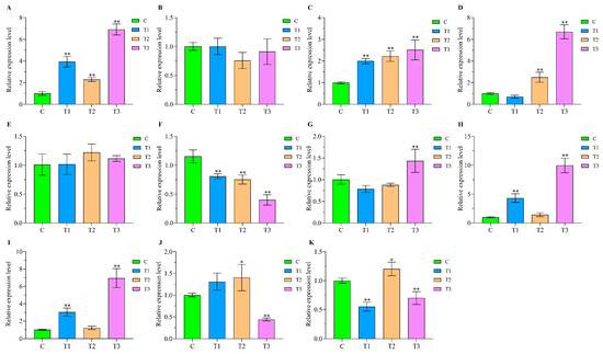qPCR validation of 11 comprehensive stress-responsive lncRNA candidates in the kidney at 24 h after heat stress. C, T1, T2, and T3 represent the 18 °C, 22 °C, 26 °C, and 30 °C heat groups, respectively. (A–K) represent lnc_MSTRG.17190, lnc_MSTRG.28492, lnc_MSTRG.22156, linc_MSTRG.12463, lnc_MSTRG.7047, lnc_MSTRG.4117, linc_MSTRG.7983, lnc_MSTRG.7990, linc_MSTRG.13517, lnc_MSTRG.9703, and lnc_MSTRG.17785, respectively. The relative expression levels of lncRNAs were measured by qPCR experiment with the 2−ΔΔCt method (the same below). * and ** indicate the significant difference (p < 0.05) and extremely significant difference (p < 0.01) between the control (C) and each heat groups (T1, T2, and T3), respectively.