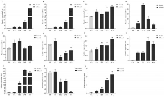 qPCR validation of 11 comprehensive stress-responsive lncRNA candidates in the kidney at 0, 6, 12, 24, and 48 h post infection with E. tarda. (A–K) represent lnc_MSTRG.17190, lnc_MSTRG.28492, lnc_MSTRG.22156, linc_MSTRG.12463, lnc_MSTRG.7047, lnc_MSTRG.4117, linc_MSTRG.7983, lnc_MSTRG.7990, linc_MSTRG.13517, lnc_MSTRG.9703, and lnc_MSTRG.17785, respectively. * and ** indicate the significant difference (p < 0.05) and extremely significant difference (p < 0.01) between the control and each infected groups, respectively.