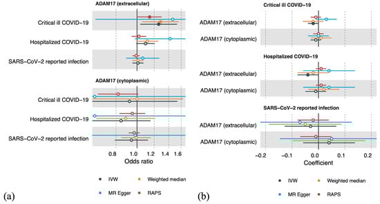 Forest plots showing results from Mendelian randomization analyses. (a) Causal effect for circulating ADAM17 on COVID-19. (b) Causal effect for COVID-19 on circulating ADAM17. IVW: inverse-variance weighted; MR Egger: Mendelian randomization Egger; RAPS: robust adjusted profile score.
