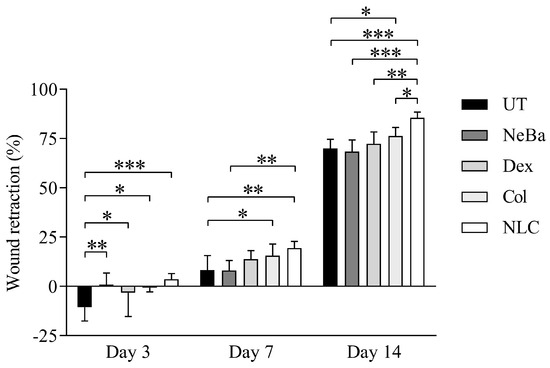 Effect of different treatments on the healing of skin wounds during 3, 7 and 14 days. * p < 0.05, ** p < 0.01, *** p < 0.001 according to one-way ANOVA and Tukey test for each period of treatment (n = 5/group). UT: wounded animals without treatment. NeBa: wounded animals treated with neomycin + sulfate bacitracin zinc. Dex: wounded animals treated with dexpanthenol. Col: wounded animals treated with collagenase. NLC: wounded animals treated with 1% Copaifera langsdorffii oleoresin loaded in nanostructured lipid carriers.