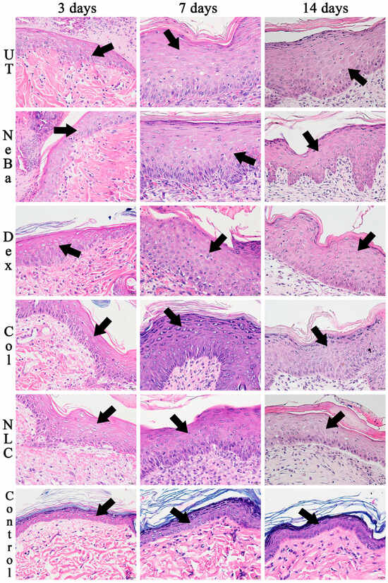 Hematoxylin and eosin photomicrographs of the epidermis in UT, NeBa, Dex, Col, NLC and Control groups during 3, 7 and 14 days. Black arrows of each photomicrography indicate the area of epidermis labeled purple. UT: wounded animal without treatment. NeBa: wounded animal treated with neomycin + sulfate bacitracin zinc. Dex: wounded animals treated with dexpanthenol. Col: wounded animals treated with collagenase. NLC: wounded animals treated with 1% Copaifera langsdorffii oleoresin loaded in nanostructured lipid carriers. Control: animals without lesions and treatment. Scale bar in each figure represents 20 µm.