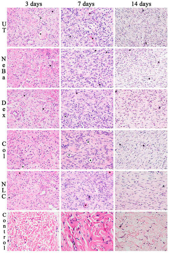 Hematoxylin and eosin photomicrographs of the center of wounds in the dermis of UT, NeBa, Dex, Col, NLC and Control groups during 3, 7 and 14 days. The area of each photomicrography represents the central region of the wound. The cells were stained purple, and the extracellular matrix was stained pink. Black asterisks indicate the blood vessels. UT: wounded animal without treatment. NeBa: wounded animal treated with neomycin + sulfate bacitracin zinc. Dex: wounded animals treated with dexpanthenol. Col: wounded animals treated with collagenase. NLC: wounded animals treated with 1% Copaifera langsdorffii oleoresin loaded in nanostructured lipid carriers. Control: animals without lesions and treatment. Scale bar in each figure represents 20 µm.