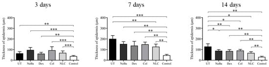 Measurement of epidermis thickness (µm) of cutaneous wounds treated with NeBa, Dex, Col or NLC during 3, 7 and 14 days. * p < 0.05, ** p < 0.01, *** p < 0.001 according to the Kruskal–Wallis test, followed by Dunn post-test (n = 5/group). UT: wounded animals without treatment. NeBa: wounded animals treated with neomycin + sulfate bacitracin zinc. Dex: wounded animals treated with dexpanthenol. Col: wounded animals treated with collagenase. NLC: wounded animals treated with 1% Copaifera langsdorffii oleoresin loaded in nanostructured lipid carriers. Control: animals without lesions and treatment.