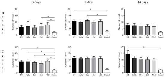 Measurement of blood vessels in the border and center of the dermis in wounds treated with NeBa, Dex, Col or NLC during 3, 7 and 14 days. * p < 0.05, ** p < 0.01 according to the Kruskal–Wallis test, followed by Dunn post-test (n = 5/group). UT: wounded animals without treatment. NeBa: wounded animals treated with neomycin + sulfate bacitracin zinc. Dex: wounded animals treated with dexpanthenol. Col: wounded animals treated with collagenase. NLC: wounded animals treated with 1% Copaifera langsdorffii oleoresin loaded in nanostructured lipid carriers. Control: animals without lesions and treatment.