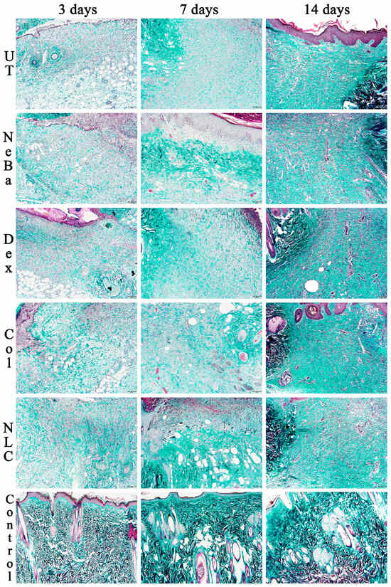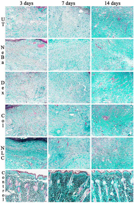 Mallory’s trichrome photomicrographs of the center of wounds in the dermis of UT, NeBa, Dex, Col, NLC and Control groups during 3, 7 and 14 days. UT: wounded animal without treatment. NeBa: wounded animal treated with neomycin + sulfate bacitracin zinc. Dex: wounded animals treated with dexpanthenol. Col: wounded animals treated with collagenase. NLC: wounded animals treated with 1% Copaifera langsdorffii oleoresin loaded in nanostructured lipid carriers. Control: animals without lesions and treatment. The greenish stain represents the area of collagen content in the center of dermis. Scale bar in each figure represents 20 µm.