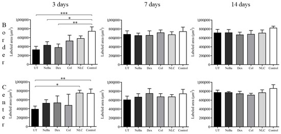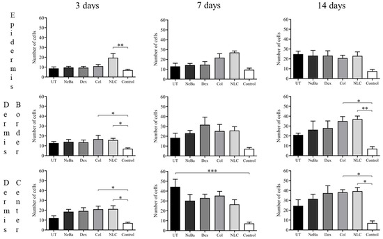 Quantification of the area (µm2) of cells in the epidermis, border and center of the dermis of cutaneous wounds of UT, NeBa, Dex, Col, NLC and Control groups during 3, 7 and 14 days. * p < 0.05, ** p < 0.01, *** p < 0.001 according to the Kruskal–Wallis test, followed by Dunn post-test (n = 5/group). UT: wounded animals without treatment. NeBa: wounded animals treated with neomycin + sulfate bacitracin zinc. Dex: wounded animals treated with dexpanthenol. Col: wounded animals treated with collagenase. NLC: wounded animals treated with 1% Copaifera langsdorffii oleoresin loaded in nanostructured lipid carriers. Control: animals without lesions and treatment.