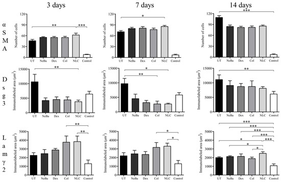 Immunolabeled area of desmoglein-3 (Dsg3) (µm2), laminin-γ2 (Lamγ2) (µm2), and number of positive α-SMA cells in skin wounds of different treatments during 3, 7 and 14 days. * p < 0.05, ** p < 0.01, *** p < 0.001 according to one-way ANOVA, followed by Tukey test (n = 5/group). UT: wounded animal without treatment. NeBa: wounded animal treated with neomycin + sulfate bacitracin zinc. Dex: wounded animals treated with dexpanthenol. Col: wounded animals treated with collagenase. NLC: wounded animals treated with 1% Copaifera langsdorffii oleoresin loaded in nanostructured lipid carriers. Control: animals without lesions and treatment.