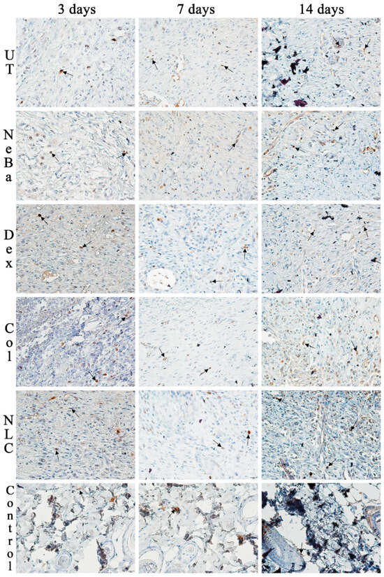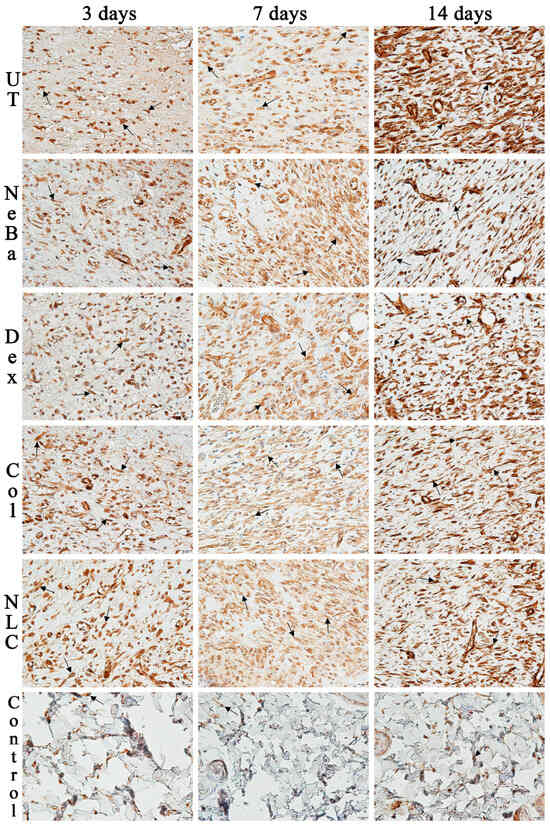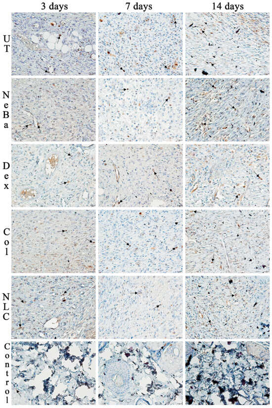 Photomicrographs of the immunolabeling of α-SMA in the dermis of wounds treated during 3, 7 and 14 days. Black arrows indicate the immunolabeled myofibroblasts (brown color) positive for α-SMA presented in the center of the dermis. The remaining tissue was counterstained with hematoxylin (blue-purple color). UT: wounded animal without treatment. NeBa: wounded animal treated with neomycin + sulfate bacitracin zinc. Dex: wounded animals treated with dexpanthenol. Col: wounded animals treated with collagenase. NLC: wounded animals treated with 1% Copaifera langsdorffii oleoresin loaded in nanostructured lipid carriers. Control: animals without lesions and treatment. Scale bar in each figure represents 20 µm.